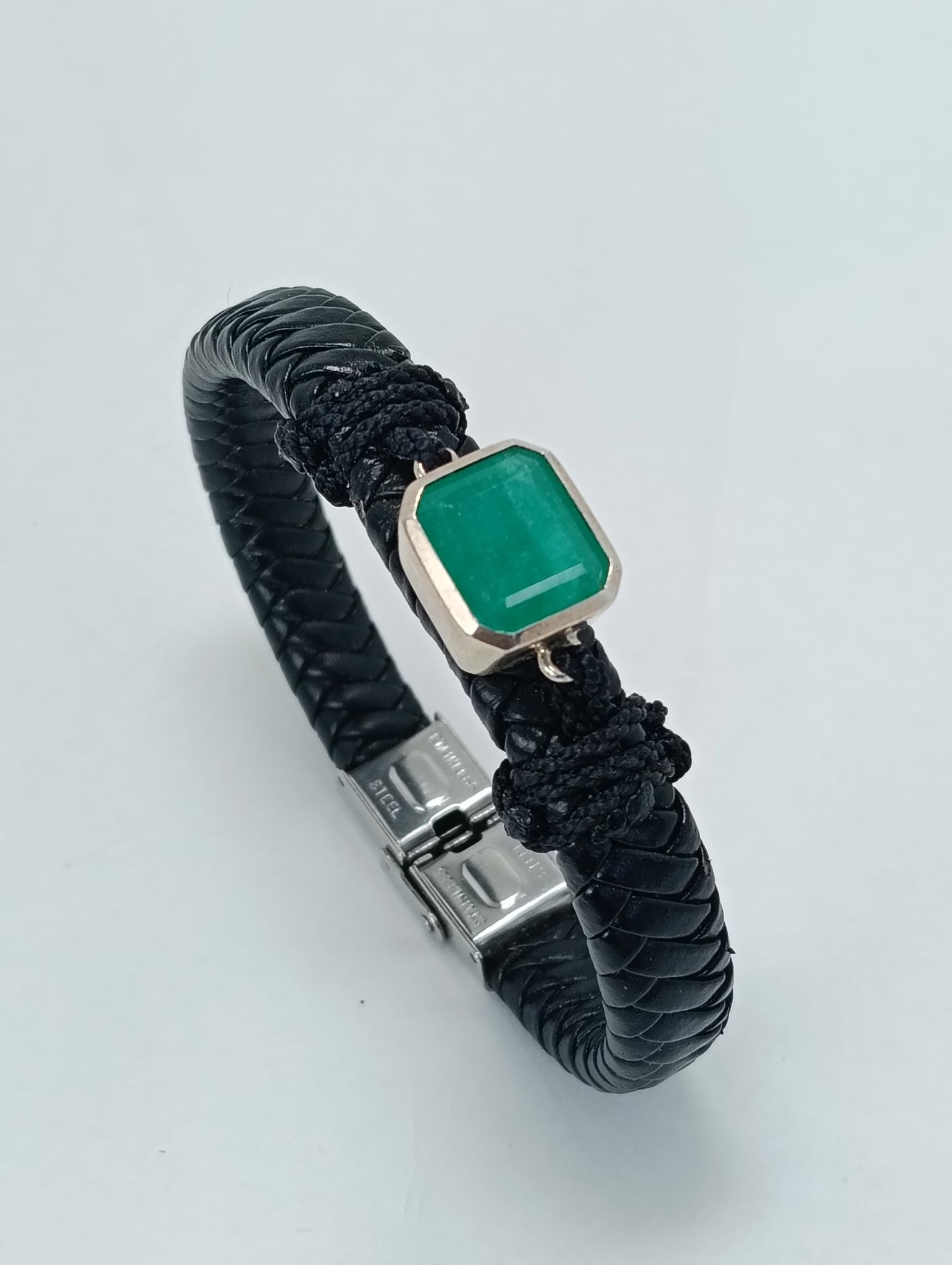 Diseño auténtico y elegante que resalta la fuerza masculina con un toque de distinción. Esta manilla para hombre combina la textura trenzada en color negro con el brillo y misticismo de una esmeralda natural en corte esmeralda, montada sobre un marco de oro que resalta su forma y color.