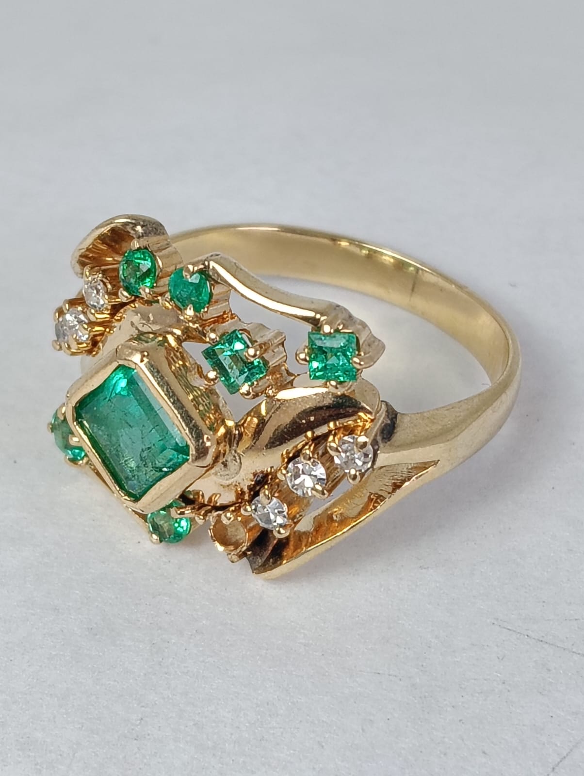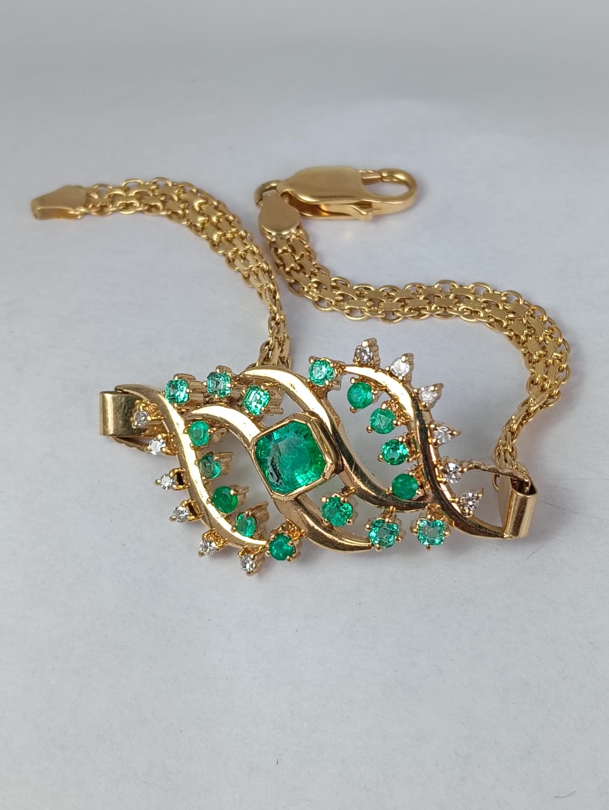 Este conjunto —collar, anillo y manilla— forma parte de la Colección Louvre React, inspirada en el esplendor de las joyas reales y en la fuerza del arte que no se roba, se crea. Cada pieza está elaborada en oro amarillo de 18 quilates, con esmeraldas naturales cuidadosamente seleccionadas de los yacimientos colombianos más prestigiosos.